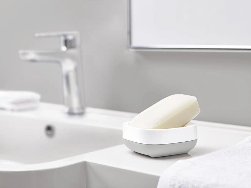 - konstrukcja korpusu mydelniczki jest pochylona, dzięki czemu mydło ułożone pod kątem szybciej obsycha, a mydelniczka zajmuje mniej miejsca,