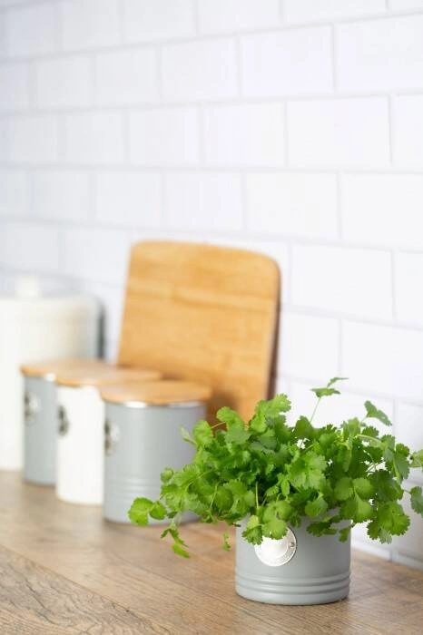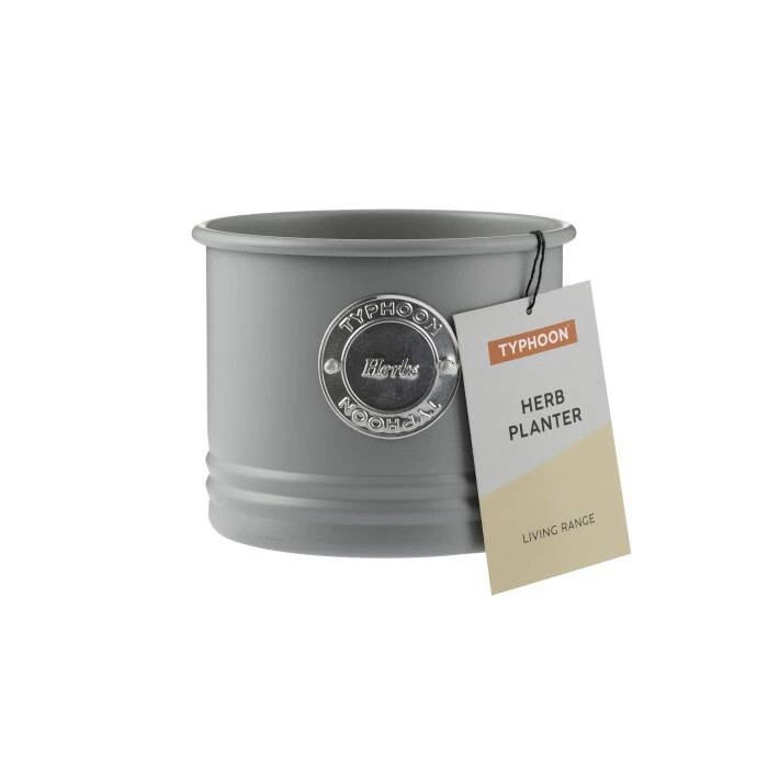 - doniczka na zioła lub osłonka na doniczkę, - wykonana ze stali malowanej na szary kolor, - styl retro, - z przodu plakietka z nazwą, - należy czyścić wilgotną ściereczką. Wymiary: 11 x 9 cm (śr. x wys.) Materiał: stal Kolor: szary Kolekcja: Living