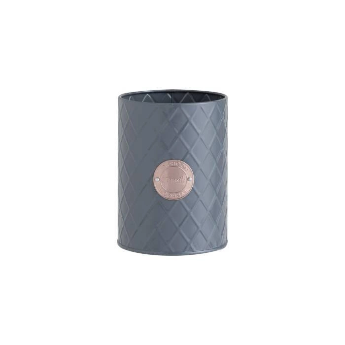 - pojemnik na wszystkie narzędzia kuchenne, - wykonany ze stali malowanej na szary kolor, - posiada fakturowane ścianki, - z przodu plakietka z nazwą, - należy czyścić wilgotną ściereczką. Wymiary: 11 x 15 cm (śr. x wys.) Materiał: stal Kolor: szary, miedziany Kolekcja: Henrik