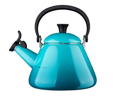 Czajniki Le Creuset Kone wyposażone są w ruchomą, składaną, nienagrzewającą się rączkę i podnoszony mocowany na stałe do dziubka gwizdek.