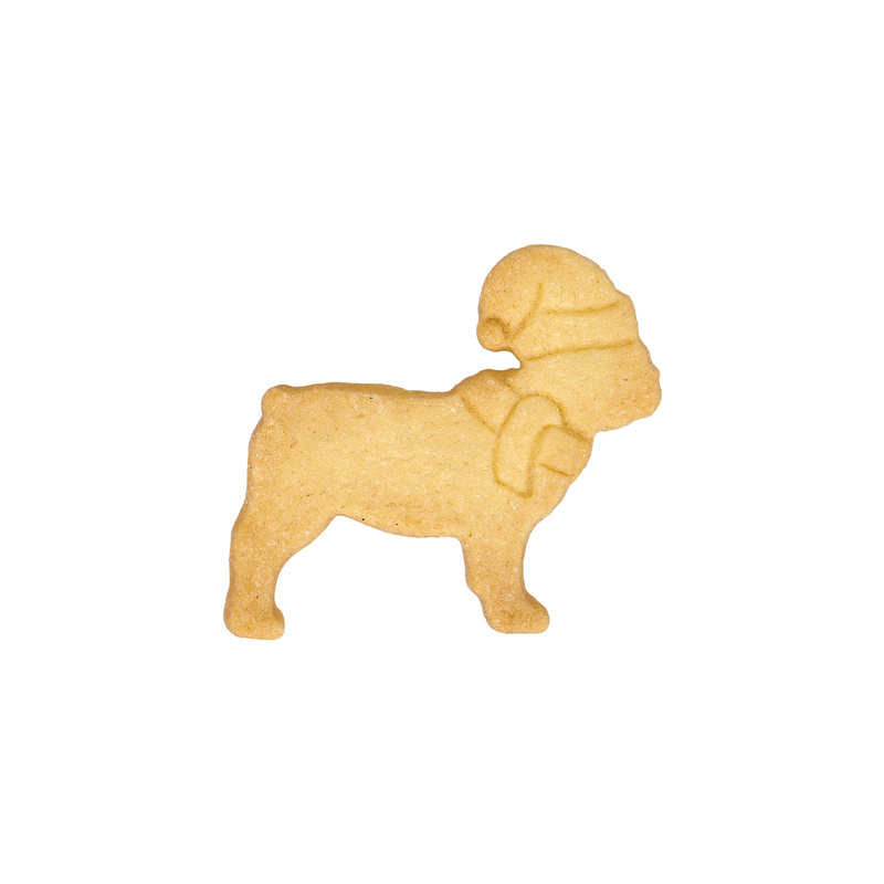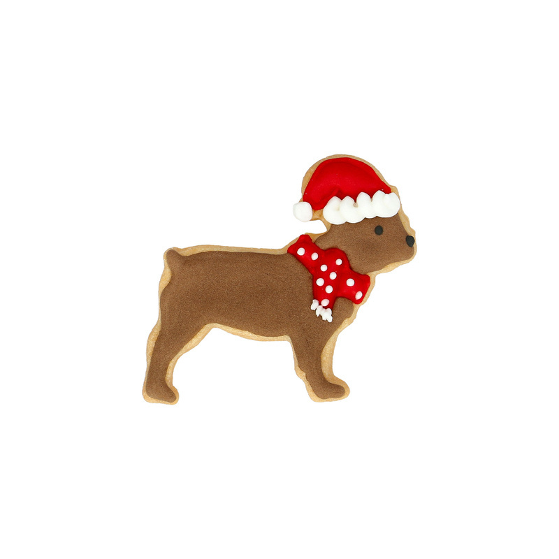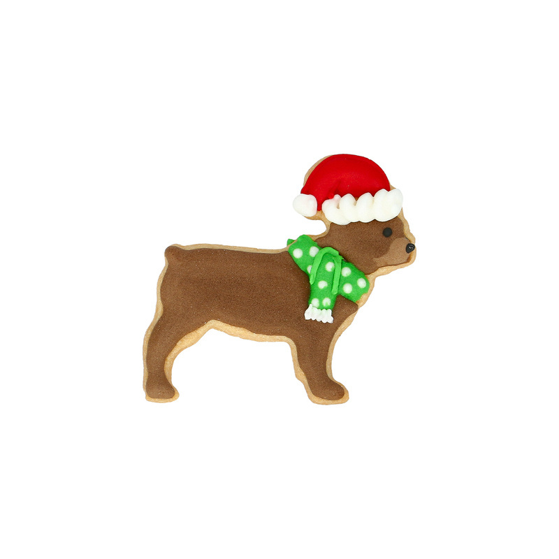 Foremka do ciastek w kształcie mastiffa w wersji świątecznej. Gwarancja wieloletniego, bezproblemowego użytkowania. Jakość i grubość stali nierdzewnej gwarantuje trwałość foremki. Ostre krawędzie umożliwiają dokładne wykrojenie ciasta, a zaokrąglone brzegi są całkowicie bezpieczne dla dłoni. Można myć w zmywarce.