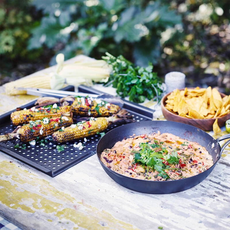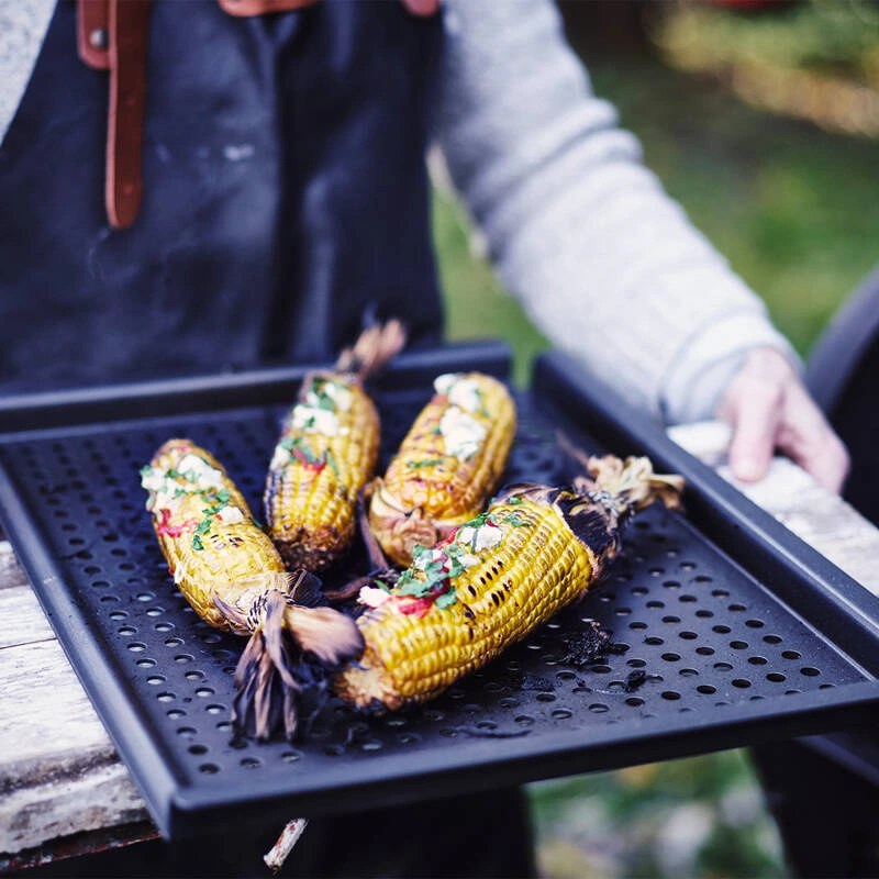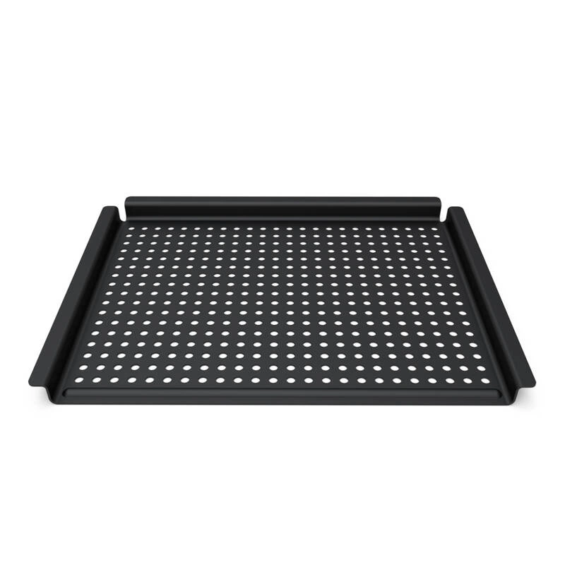 Blacha z wygodnymi uchwytami i z perforacją do grillowania warzyw, owoców morza, szaszłyków, steków, kotletów - bez obawy, że jakiś kawałek wpadnie do ognia. Przeznaczona jest do używania bezpośrednio na grillu. Jest wykonana ze stali węglowej i zapewnia potrawom dymny aromat. Ten rodzaj blachy szybko się nagrzewa, co pozwala przygotowywać potrawy wymagające różnego stopnia wysmażenia. Do użytku na wszystkich rodzajach grilli oraz na otwartym ogniu (ognisko). Wytrzymałość temperaturowa wynosi około 370 °C. Ważne! Korzystając z blachy na grillu lub ognisku należy stosować rękawice kuchenne chroniące przed gorącem. Do mycia wystarczy ciepła woda z odrobiną płynu do mycia naczyń. Po umyciu blachę należy wytrzeć do sucha szmatką. Przed pierwszym użyciem blachę należy umyć z ochronnej warstwy woskowej.
