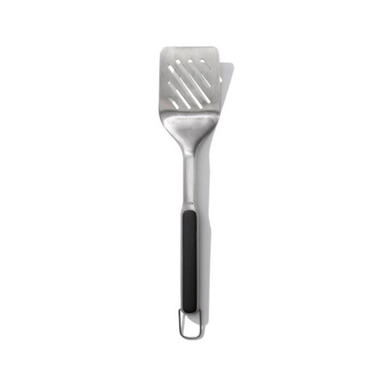 Stalowa łopatka do grillowania marki OXO posiada szeroką, skośną końcówkę oraz podwójnie wygięte boki, wzmacniające budowę i ułatwiające podnoszenie i obracanie potraw. Przeznaczona do grillowania burgerów, steków itp. Posiada metalowe ucho do zawieszenia narzędzia podczas grillowania. Produkt można myć w zmywarce.