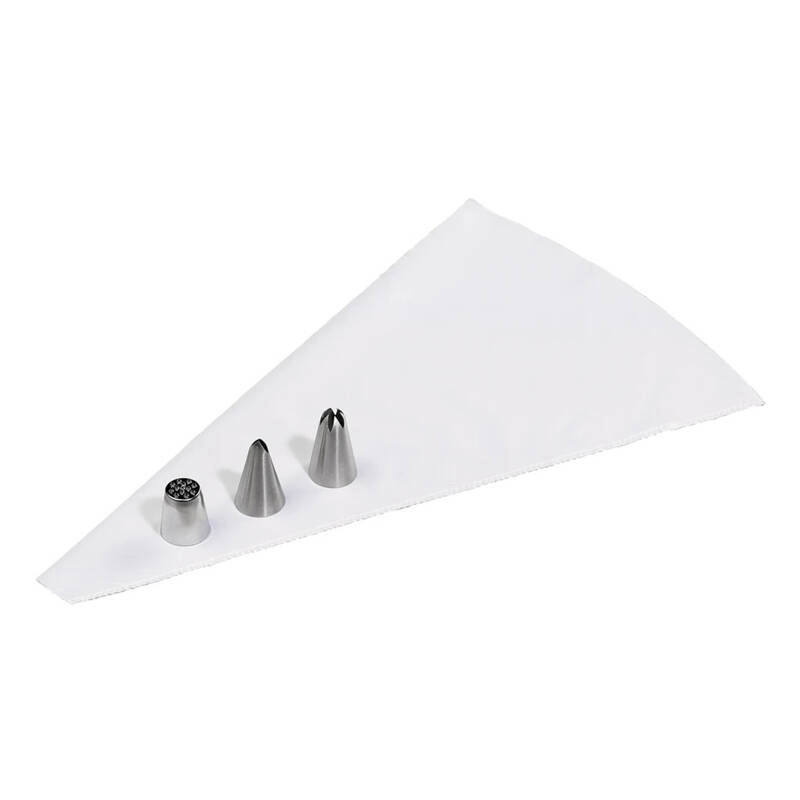 Wielorazowy rękaw cukierniczy z 3 końcówkami. Tylką z niewielkimi otworami stworzymy piękne teksturowe dekoracje przypominające trawę lub zwierzęce futerko. W zestawie znajduje się tylka płaska ( proste i falowane liście), tylka w kształcie gwiazdy (do kwiatów) oraz tylka do dekoracji typu trawa, futerko zwierzaka. Rękaw myć ręcznie, końcówki można myć w zmywarce.