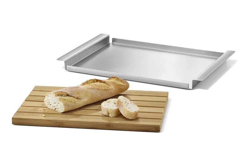 Deska do krojenia ZACK. Wyciągany bambusowy wkład. Gumowe nóżki zapobiegają rysowaniu blatu. Stal nierdzewna 18/10 matowa