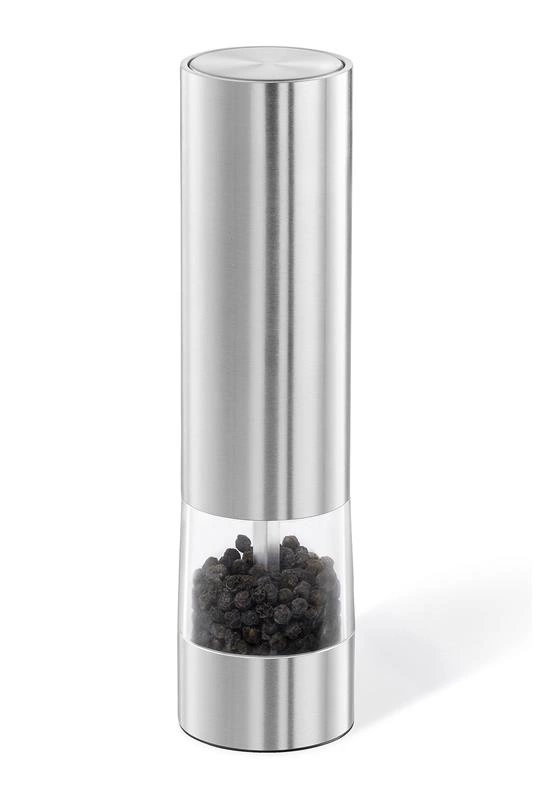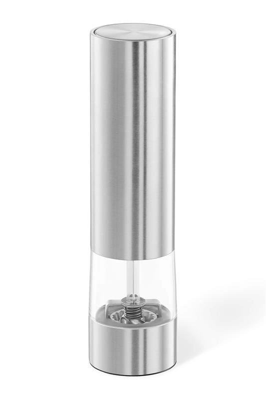 Młynek do pieprzu ZACK. Metalowe żarna pozwalają na płynną regulację grubości mielenia. Zasilany na cztery bateria AAA (R3). Stal nierdzewna 18/10 matowa