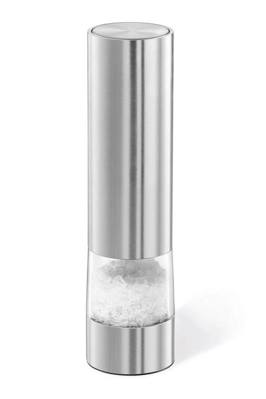 Młynek do soli ZACK. Ceramiczne żarna pozwalają na płynną regulację grubości mielenia. Zasilany na cztery bateria AAA (R3). Stal nierdzewna 18/10 matowa