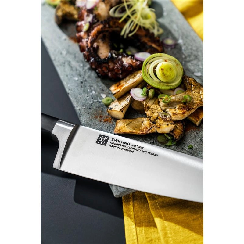 Nóż szefa kuchni z serii ALL * STAR od ZWILLING to narzędzie, które wie, jak inspirować prawdziwego miłośnika kuchni. Doskonałe właściwości tnące, idealnie opracowany kształt uchwytu, odporność na korozję - a wszystko to w wydaniu najwyższej jakości. Jeśli w ulubionych przyborach cenisz sobie wielofunkcyjność i uniwersalność, nie ma lepszego wyboru. Ten wybitny pomocnik nadaje się do krojenia mięs i ryb, warzyw oraz do siekania ziół.