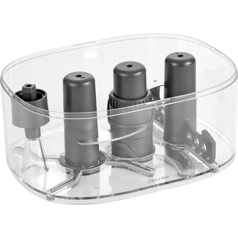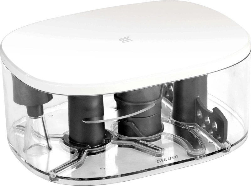 Wszystko, co jest czasochłonne, energochłonne i żmudne, wielofunkcyjny przetwornik żywności ZWILLING Enfinigy zrobi za Ciebie za naciśnięciem jednego przycisku. A jeśli akurat w danym momencie go nie potrzebujesz, możesz go wygodnie przechować oszczędzając miejsce na pozostały sprzęt: zestaw uzupełniony został dwoma oddzielnymi pojemnikami do przechowywania wyposażenia.