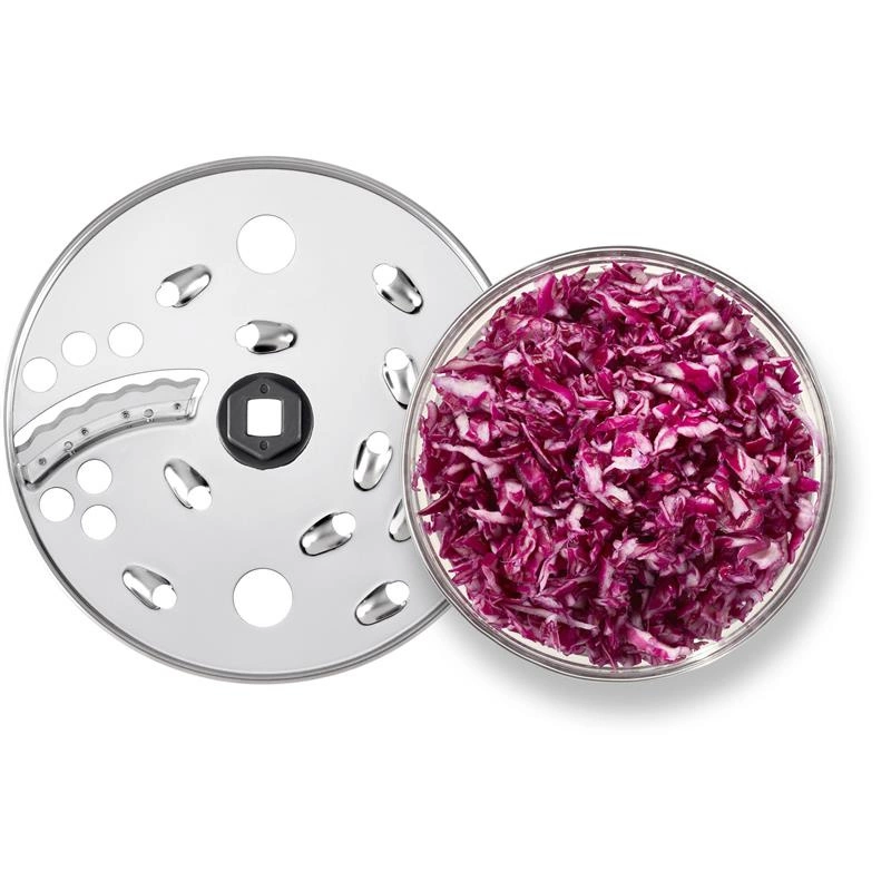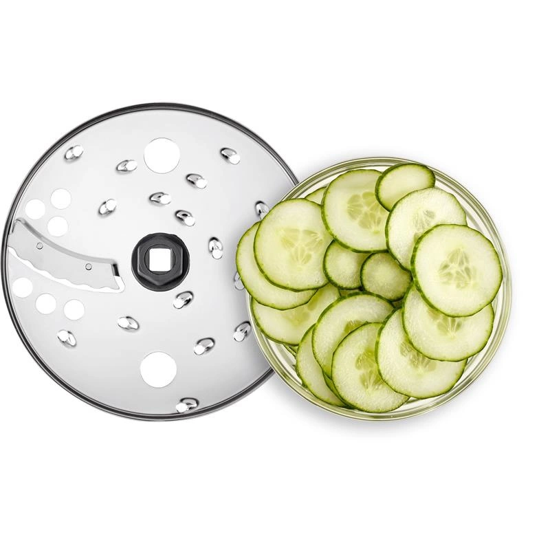 - 5 wkładek z ostrzami, 7 funkcji: tarcza do krojenia drobno i tarcia, tarcza do krojenia grubo i tarcia, hak do ciasta, rozdrabniacz, przystawka do mieszania