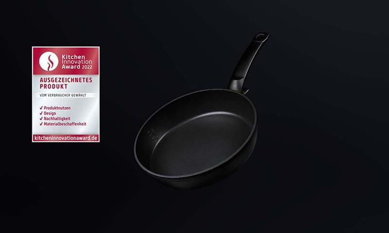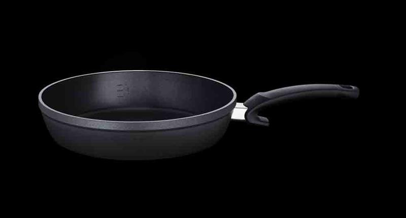 Ergonomiczny uchwyt wyposażony w zabezpieczenie przed poparzeniem palców, służy również do łatwiejszego przenoszenia patelni.