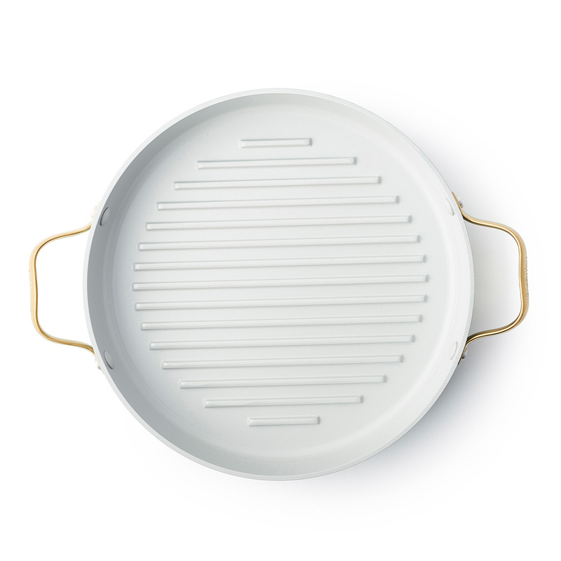 Patelnia grillowa z ceramiczną powłoką z kolekcji Padova - luksusowe wzornictwo i materiały, z których została wykonana. Ulubiona patelnia influencerów i stylistów jedzenia. Wyjątkowe połączenie kolorystyczne: niebieskiego koloru patelni i garnków ze złotymi, stalowymi uchwytami. Patelnia pokryta jest zdrową, ekologiczną* powłoką ceramiczną Thermolon Infinity Pro wzmocnioną diamentami, wolną od PFAS. Powłoka jest gładka, co powoduje, że potrawy nie przylegają do niej. Grube dno wykonane w technologii Magneto, które można stosować na wszystkich rodzajach kuchenek, także indukcyjnych. Patelnia się szybko nagrzewa i rozprowadza ciepło oraz je kumuluje, dlatego też należy z niej korzystać na średnich mocach kuchenek, co pozwala oszczędzać energię elektryczną. Można z niej korzystać w piekarniku do 220oC. Uchwyty patelni - technologia PVD. Właściwości antyalergiczne uchwytu. Można myć w zmywarce, rekomendacja mycia ręcznego w celu wydłużenia żywotności powłoki patelni.