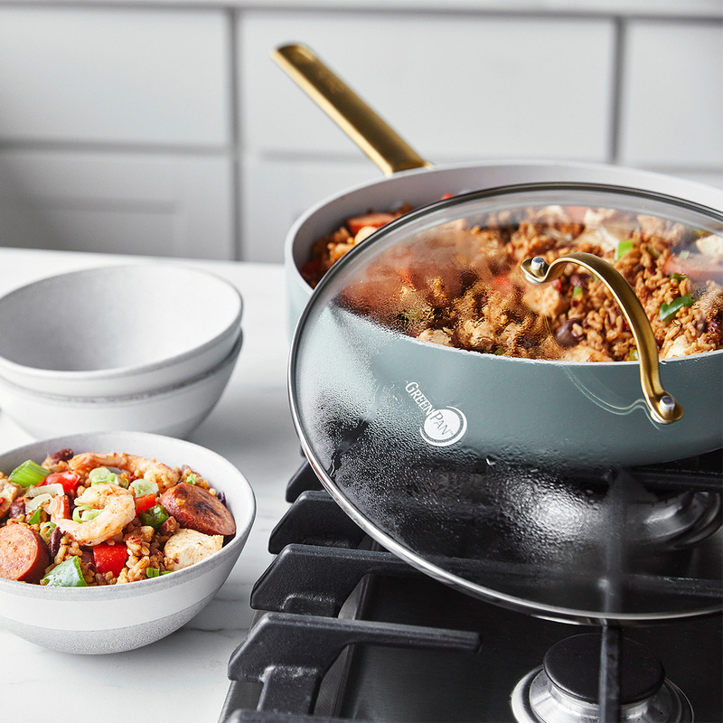 Głęboka patelnia ceramiczna ze szklaną pokrywką z kolekcji Padova - luksusowe wzornictwo i materiały, z których została wykonana. Ulubiona patelnia influencerów i stylistów jedzenia.