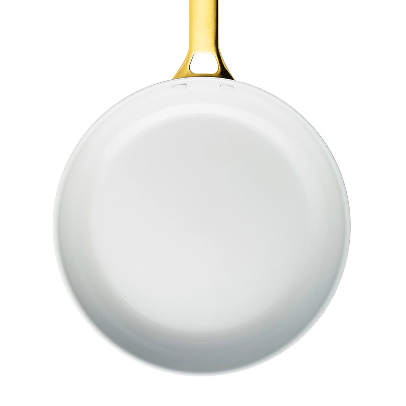 Patelnia Padova Sky Blue od GreenPan to połączenie wyjątkowego designu w stylu vintage z zaawansowaną technologią gotowania. Jej elegancka, błękitna powłoka z jasnym wnętrzem i matowe, złote uchwyty ze stali nierdzewnej sprawiają, że jest nie tylko funkcjonalna, ale też przyciąga wzrok — idealna do nowoczesnych i klasycznych kuchni.