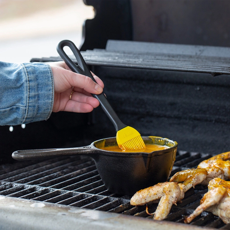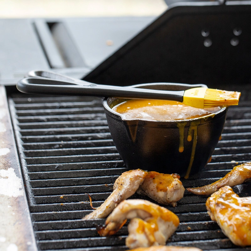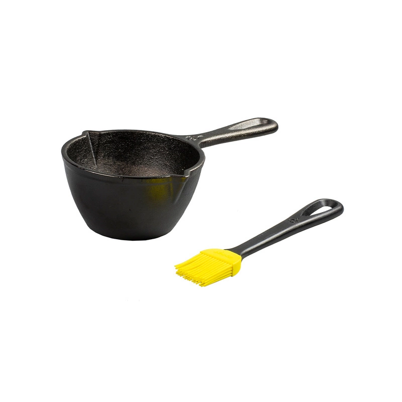 Żeliwny rondelek z silikonowym pędzelkiem - przygotujesz i rozsmarujesz sosy i marynaty. Można używać na wszystkich źródłach ciepła, kuchenkach gazowych, elektrycznych, indukcyjnych oraz w piekarniku, na otwartym ogniu oraz grillu. Podczas korzystania z rondelka należy pamiętać, aby używać rękawic ochronnych. Pędzelek rozsmarowuje np. roztopione masło na kolbach kukurydzy lub marynatę na grillowanych mięsach. Główka pędzelka jest zdejmowana, co ułatwia dokładne czyszczenie. pędzelka można używać do 230 stopni C. Rondelek należy myć ręcznie, a po umyciu osuszyć i zaimpregnować olejem. Pędzelek można myć w zmywarce.