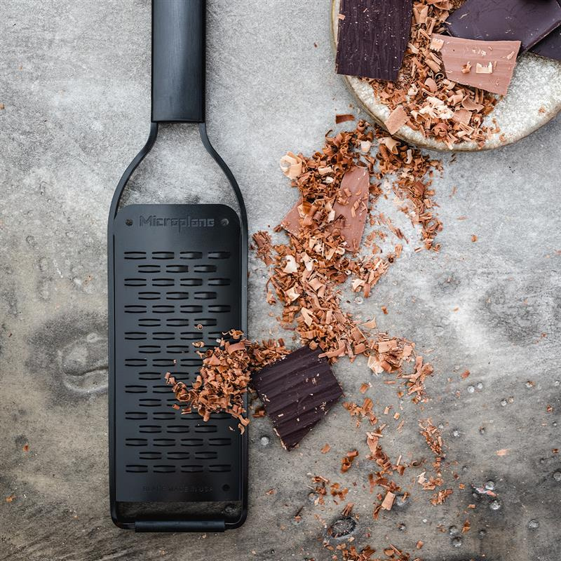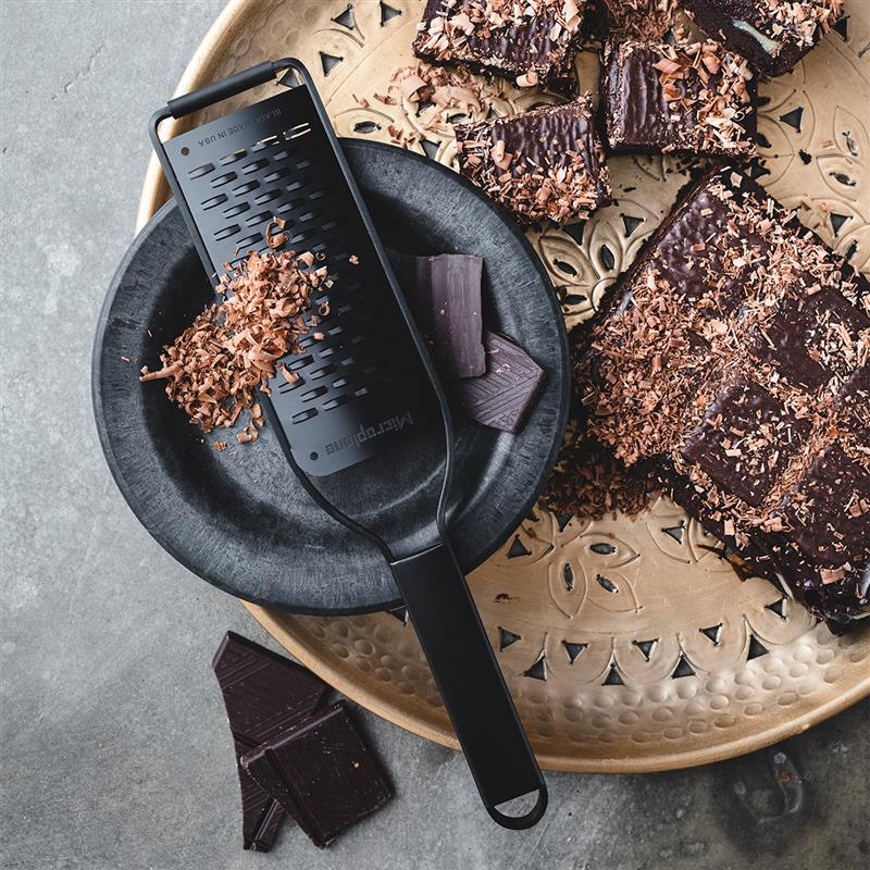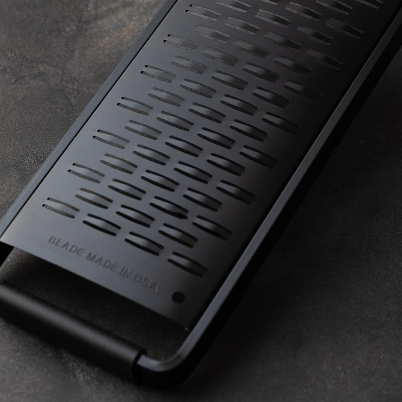 Tarka do tarcia twardego sera, jabłek, marchewki, cukinii, czekolady, zimnego masła, wykonana z czarnej stali nierdzewnej pokrytej powłoką PVD. Powłoka zapewnia gładką powierzchnię stali. Tarka jest hypoalergiczna, co pozwala na korzystanie z tarek przez osoby ze skórą wrażliwą i podatną alergii. Ostrza tarek produkowane są w USA metodą fototrawienia. Stelaż tarki wykonany jest z grubej stali. Posiada gumową końcówkę zabezpieczającą blat przed porysowaniem. W komplecie znajduje się plastikowy ochraniacz na ostrze, wybarwiony na czarny kolor. Zapakowana w efektowne, kartonowe pudełko, dzięki czemu świetnie nadaje się na prezent.