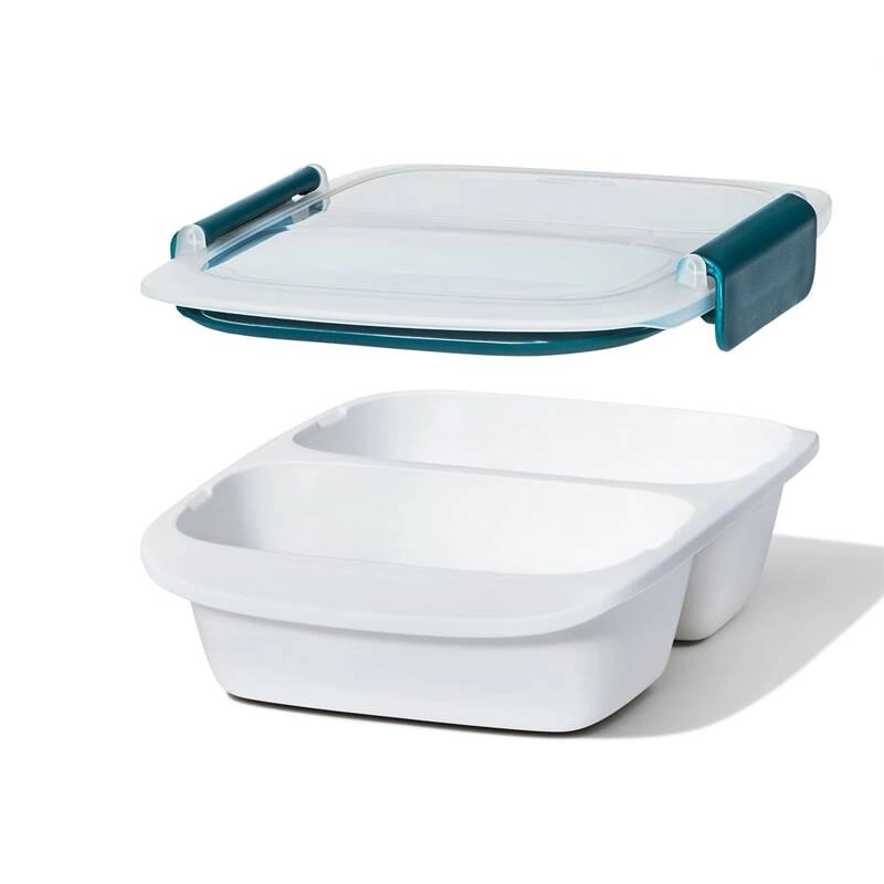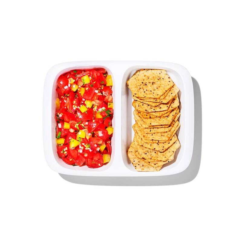 Pojemnik 2-komorowy OXO Good Grips Prep&Go z przegródką na dwie porcje małych przekąsek. Pokrywka posiada 2 silikonowe osobne uszczelki i boczne zatrzaski zapewniające szczelność pojemnika. Można je łatwo zdjąć do mycia. Lunchbox można myć w zmywarce oraz używać w mikrofalówce.