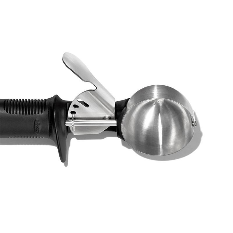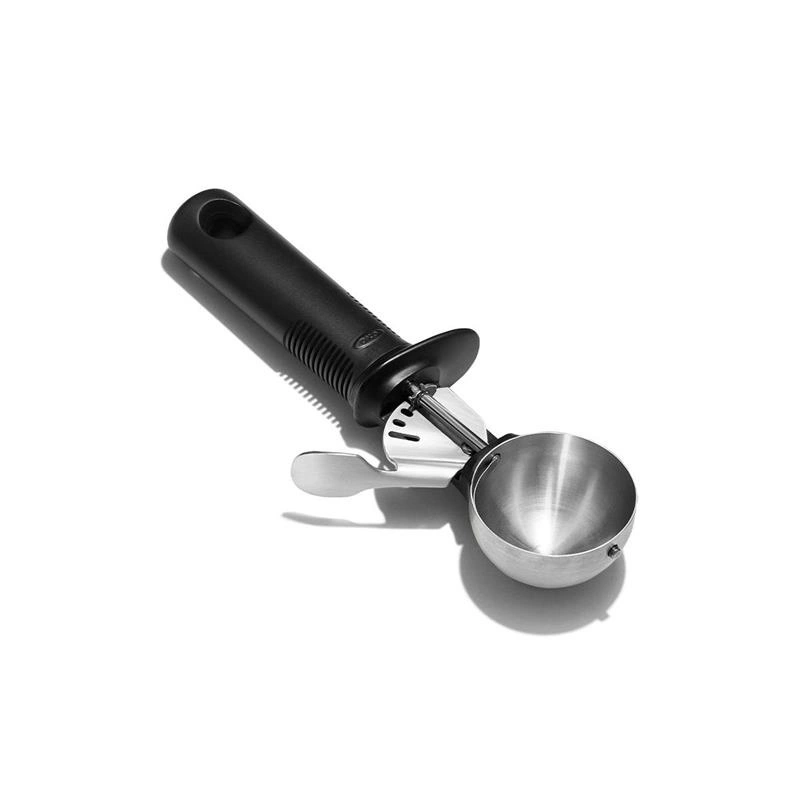 Klasyczna łyżka do lodów z dźwignią do lodów, sorbetów, ziemniaków i ryżu. Wykonana ze stali nierdzewnej i polipropylenu. Posiada, jak wszystkie narzędzia kuchenne OXO, wygodną, miękką rączkę, która umożliwia użycie mniejszej siły, niż zwykle, to wybrania kulek z twardych, zamarzniętych lodów. Można myć w zmywarce.