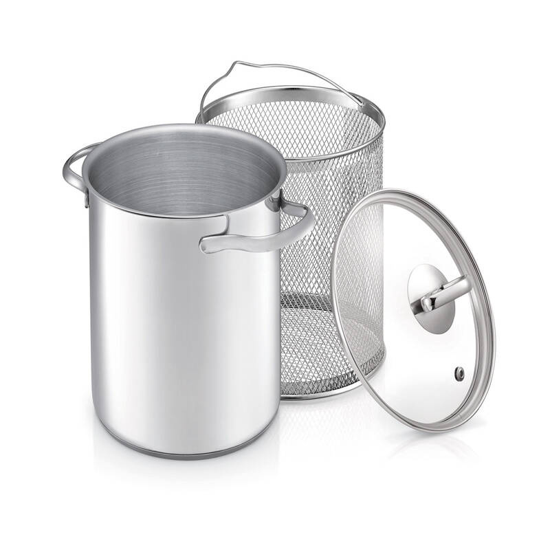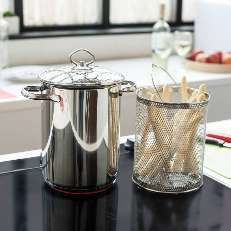 Wysoki garnek z wewnętrznym sitkiem do gotowania szparagów, makaronu oraz blanszowania warzyw. Garnek oraz sitko wykonane ze stali nierdzewnej, praktyczne boczne uchwyty, szklana pokrywka z uchwytem i otworem odpowietrzającym. Można myć w zmywarce. Działa na wszystkich źródłach ciepła, także na kuchenkach indukcyjnych. Można używać w piekarniku do 200°C.