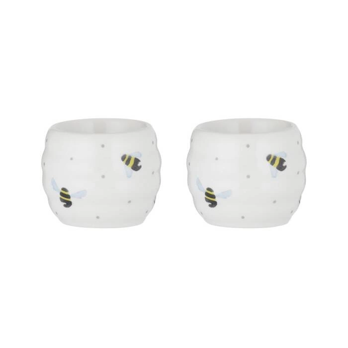 PK - Zestaw 2 kieliszków na jajka, Sweet Bee- zestaw 2 kieliszków na jajko, - wykonane z kamionki, - kształtem przypominają ul, - ozdobione motywami pszczół, - można używać ich w mikrofalówce, - nadają się do zmywarki. Wymiary: 5,9 x 5,9 x 4,9 cm (dł. x szer. x wys.) Materiał: kamionka Kolor: biały, żółty Kolekcja: Sweet Bee