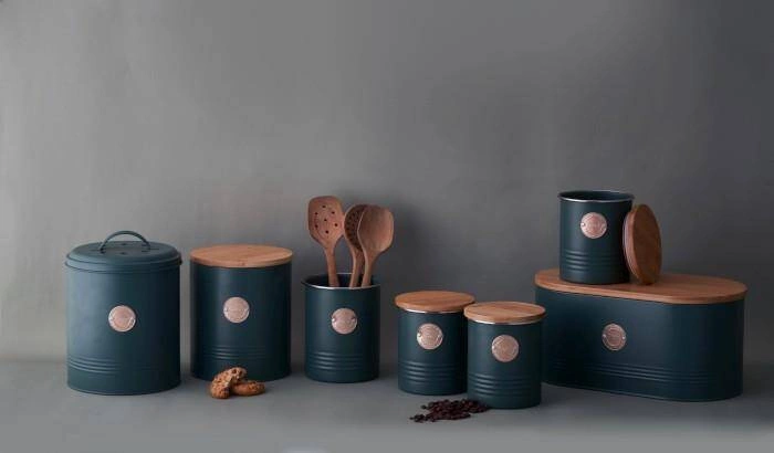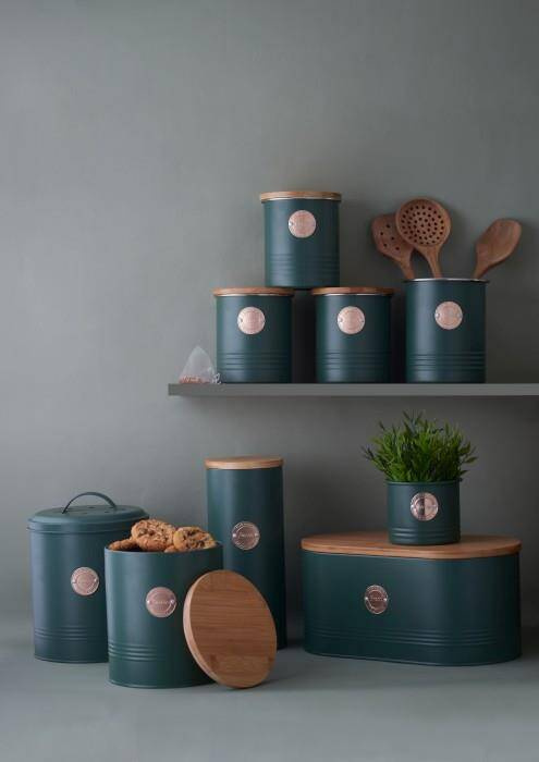 Typhoon - Pojemnik na herbatniki, ciemnozielony, Livin - pojemnik na ciastka z kolekcji Living, - wykonany z malowanej stali węglowej, - posiada pokrywkę z włókna bambusowego z uszczelką, - na przedniej ściance plakietka z mosiądzu z nazwą zawartości, - pojemnik należy czyścić ręcznie. Wymiary: 16 x 18 cm (śr. x wys.) Pojemność: 2,6 l Materiał: stal węglowa, mosiądz, bambus Kolor: zielony Kolekcja: Living