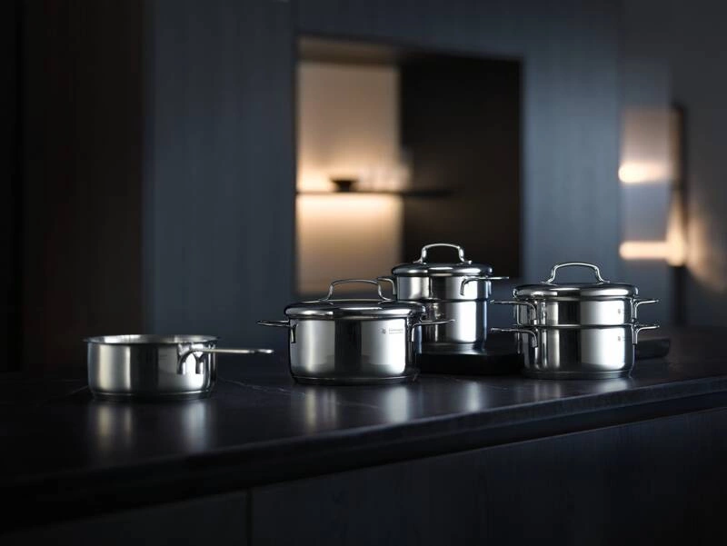 Materiał: stal nierdzewna 18/10 typu Cromargan®, szkło z silikonem (pokrywki)