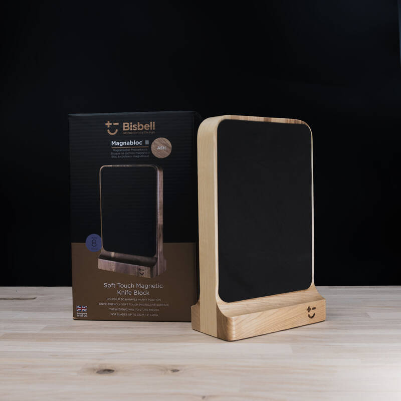 Blok marki Bisbell wykonany został z jesionu. Wyposażony w 8 magnesów po 4 na stronę pomieści nawet do 8 noży. Jest to produkt łatwy w użyciu i pozwala z łatwością dobrać noże dzięki ich pełnej widoczności. Neoprenowy materiał nałożony na drewno jest bardzo miękki oraz zapobiega rysowaniu się noży.
