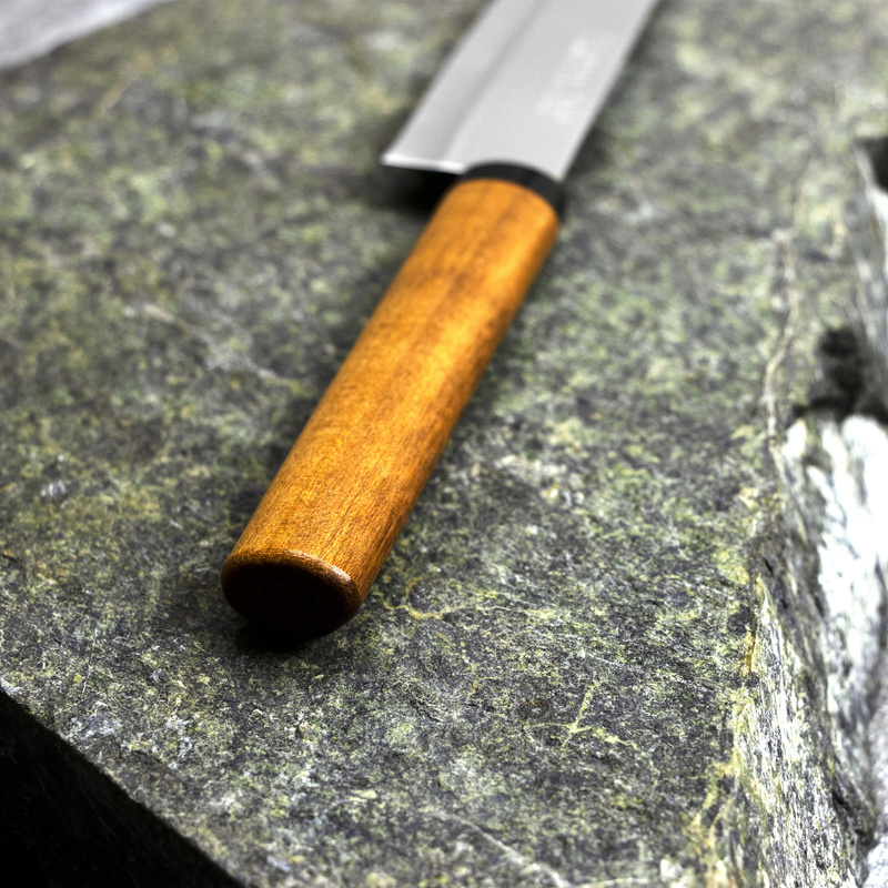 Prosty nożyk do owoców wykonany ze stali 420J2, doskonale sprawdzi się w małych zadaniach jak krojenie owoców czy obieranie. Wyposażony w drewnianą pochwę zapewnia bezpieczeństwo ostrzu i bez problemu możemy zabrać go na obóz czy wypad w góry.