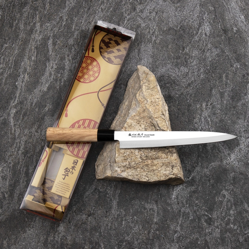 Nóż do sashimi (Yanagi) to tradycyjny japoński nóż, który służy do krojenia świeżych filetów na niemal przezroczyste plastry. Znakomicie się sprawdza podczas przygotowywania sushi, rybnego carpaccio oraz innych potraw z bardzo delikatnych składników. Długie, wąskie i sztywne ostrze zapewnia drobiazgową precyzję, a jednostronny szlif – czyste cięcie. Nożem Yanagi najlepiej wykonywać jednostajny ruch w jednym kierunku: do siebie. Nóż przeznaczony dla osób leworęcznych.