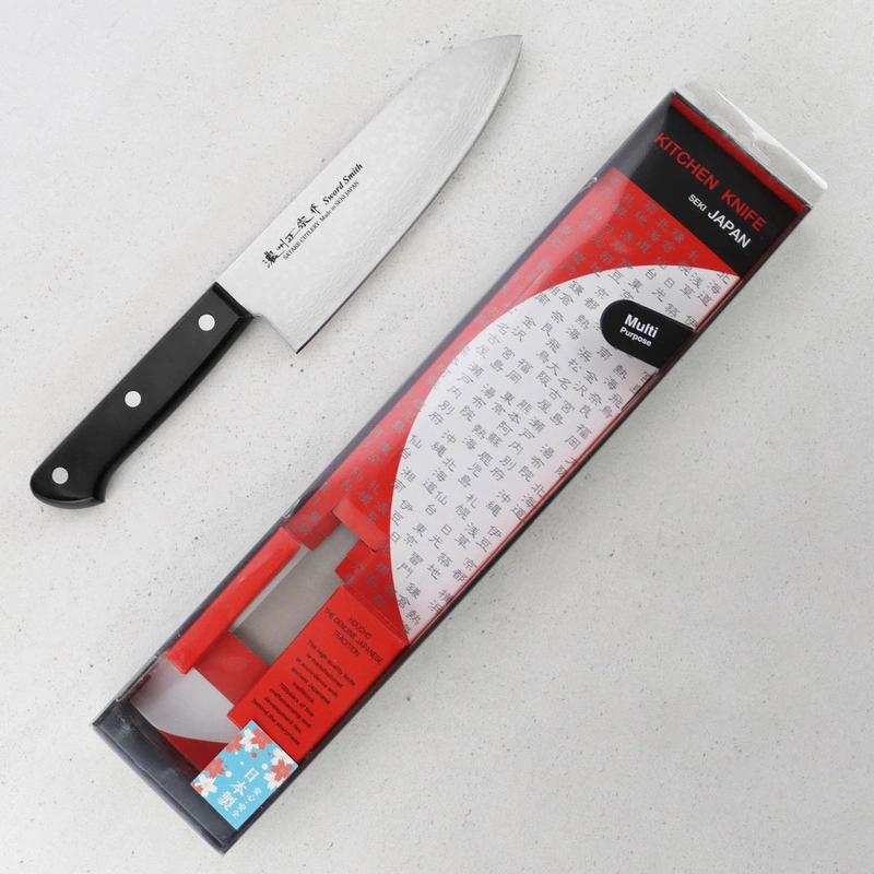 Japoński nóż o wszechstronnym zastosowaniu, przeznaczony głównie do mięsa, warzyw i ryb. Nóż Santoku posiada cienkie ostrze, znakomicie się też sprawdzi przy plastrowaniu owoców czy siekaniu ziół. Duża klinga ułatwia przenoszenie pokrojonych produktów do salaterki lub na patelnię.