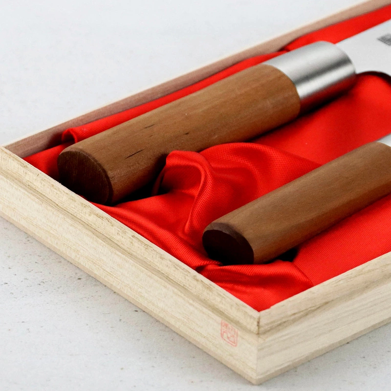 Zestaw 2 noży kuchennych zapakowany w tradycyjne drewniane opakowanie idealnie nadaję się na prezent dla każdego miłośnika gotowania.