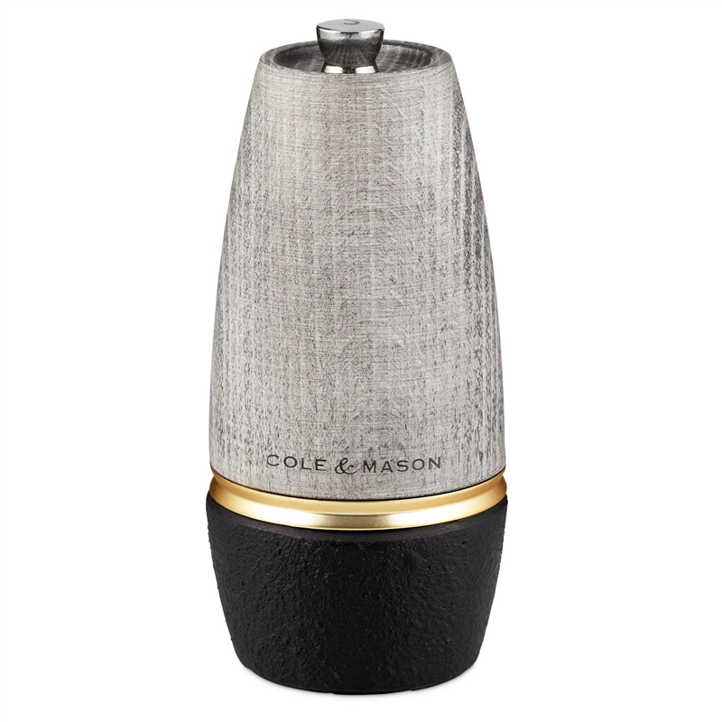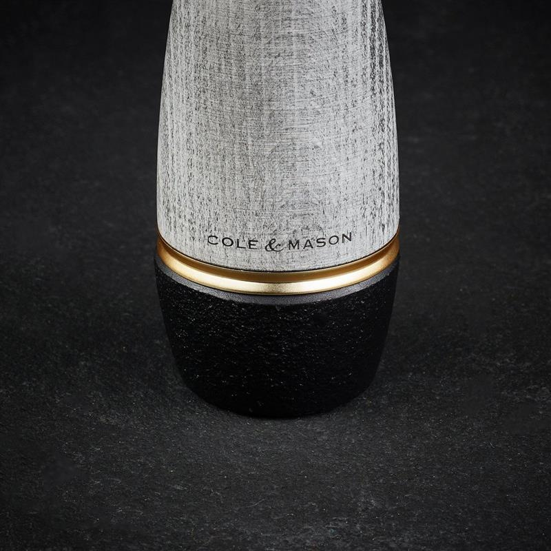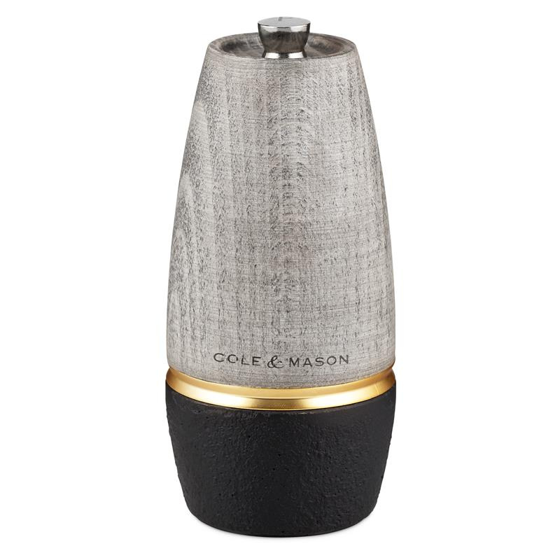 Młynek Bridgwater wyróżnia oryginalny kształt oraz niecodzienne połączenie dwóch materiałów, jakimi są drewno i żeliwo, nadając mu ponadczasowy charakter. Góra młynka to zabarwione na szaro drewno bukowe, które oddziela złota opaska od żeliwnego pokrytej czarnym lakierem dolnej części.