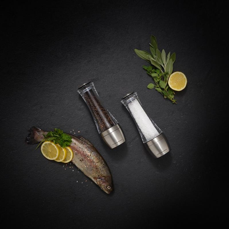 Młynek Amesbury wyróżnia oryginalny kształt, z kolei nowoczesny wygląd to zasługa połączenia akrylu z matową stalą, w niezwykle eleganckiej a zarazem praktycznej formie. Akryl jest w pełni przeźroczysty, dzięki czemu możesz kontrolować jaka przyprawa i jaka jej ilość znajduje się wewnątrz. Dodatkowo Twoja przyprawa jest ozdobą stołu! Akryl jest materiałem wysokiej jakości, nie żółknie jak szkło, czy plastik, jest też od nich trwalszy. Dół młynka oraz ozdobny element na górze wykonany jest z matowej stali nierdzewnej.