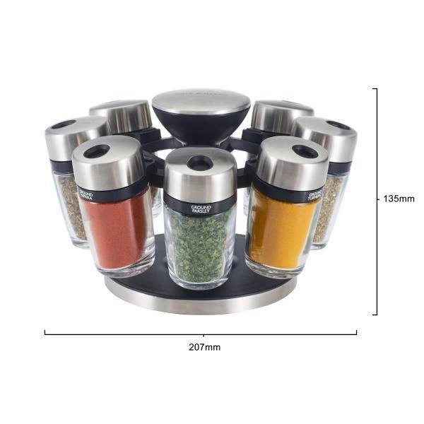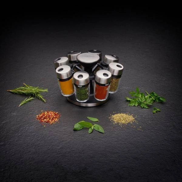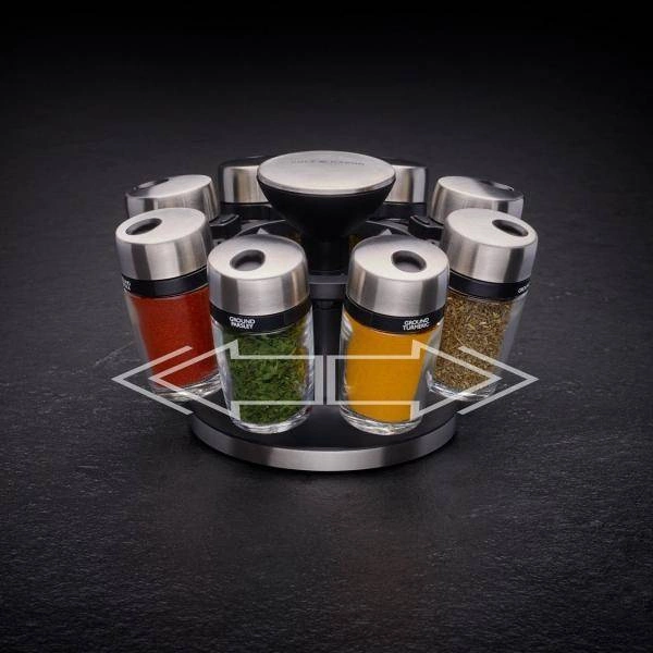 Czarna karuzela ma wysokość 13 cm i jest w pełni obrotowa, ułatwia dostęp do każdego słoiczka. Słoiczki są szklane, dzięki czemu zawartość jest świetnie widoczna, natomiast nakrętka jest wykonana ze stali nierdzewnej i posiada obrotowy system zamykania - 1 duży otwór do ziół i grubszych ziaren, 2 drobne i sypkie przyprawy. Nazwy ziół i przypraw są napisane na zewnętrznej stronie pokrywy, aby ułatwić dostęp podczas gotowania.