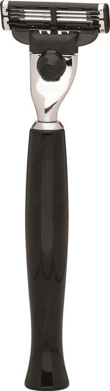 Czarna, elegancka rękojeść wykonana została z żywicy syntetycznej. Stabilny uchwyt maszynki ma ergonomiczny kształt zapewniając wygodę trzymania w dłoni. Sprawdzone ostrze Mach 3 gwarantuje dokładne golenie z mniejszym podrażnieniem skóry. Pasek Lubra zapewnia gładkie przesuwanie i chroni przed podrażnieniami skóry, a osłona napina skórę w celu optymalnego golenia i przygotowuje włosy do golenia.