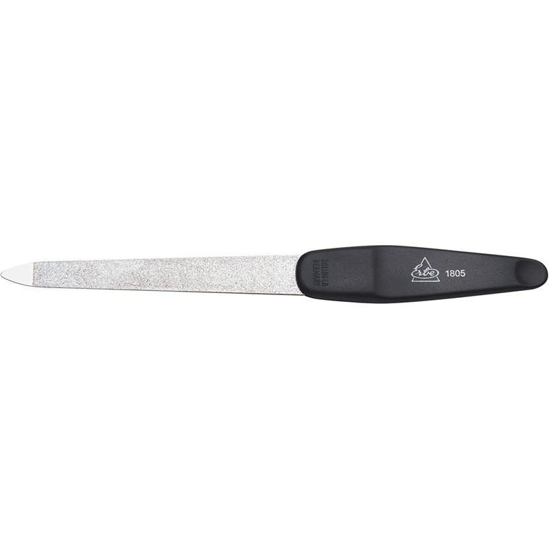 Wykonany ze stali chromowanej powlekanej szafirowym pyłem. Z jednej strony gruboziarnisty - szybko nada pazokciom pożądany kształt, z drugiej drobnoziarnisty do ich wygładzania