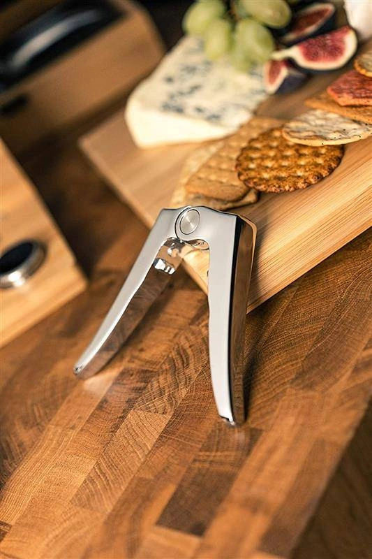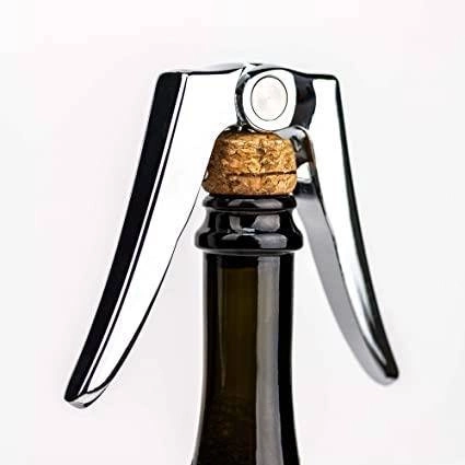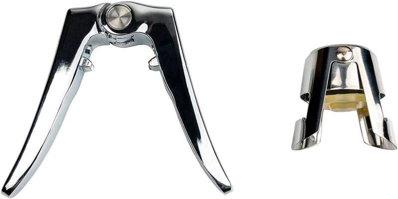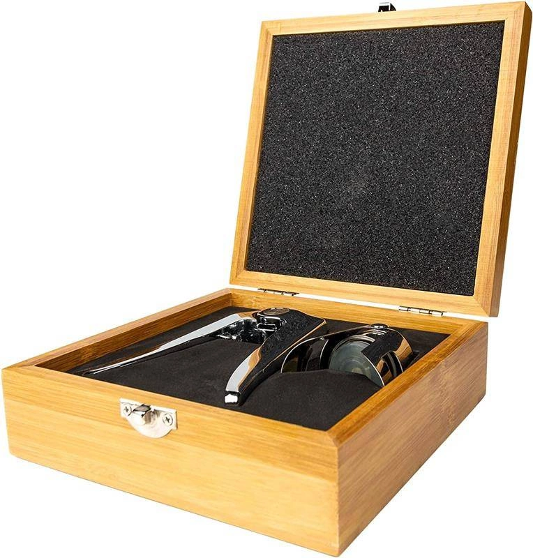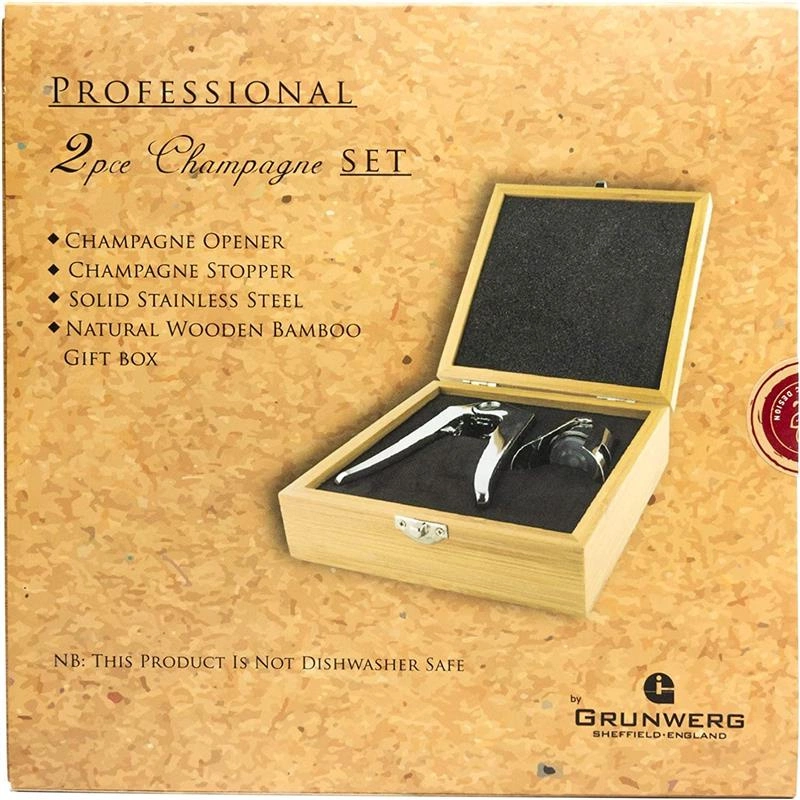 W bambusowej skrzynce znajduje się otwieracz do szampana wykonany z chromowanej stali nierdzewnej oraz zatyczka do zamknięcia otwartej wcześniej butelki.