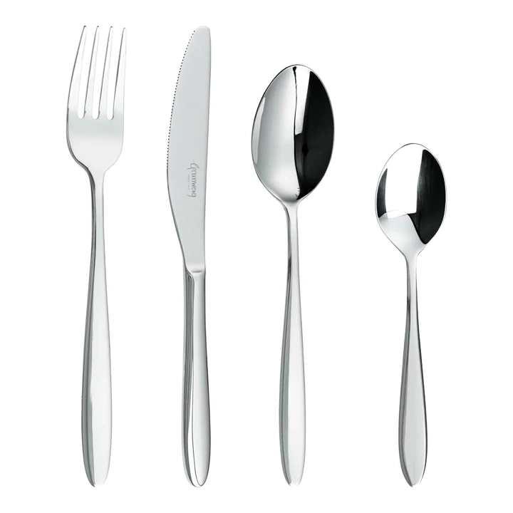 Wszystkie elementy wykonane są z wysokiej jakości stali nierdzewnej 18/10, dzięki czemu są wytrzymałe i trwałe. Sztućce wykończone są na wysoki połysk, mają eleganckie, zaokrąglone uchwyty.