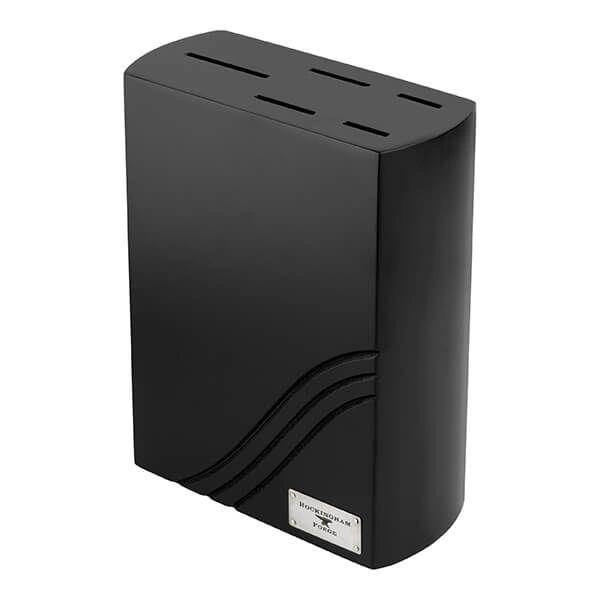 Stojak do noży ma nowoczesny kształt, wykonany został z drewna pokrytego lakierem w kolorze czarnym matowym.