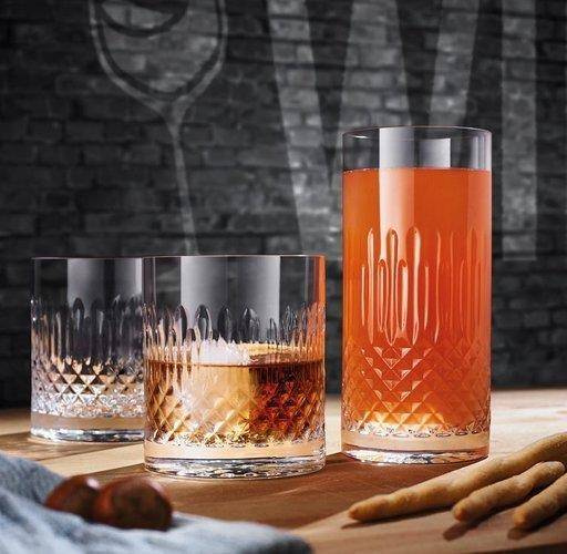 Zestaw 4 szklanek do whisky oraz drinków z kolekcji inspirowanej splendorem art deco. Seria naczyń Diamante bez wątpienia przyciąga wzrok swymi zdobieniami, które w połączeniu z barwą trunku tworzą niesamowity efekt wizualny.