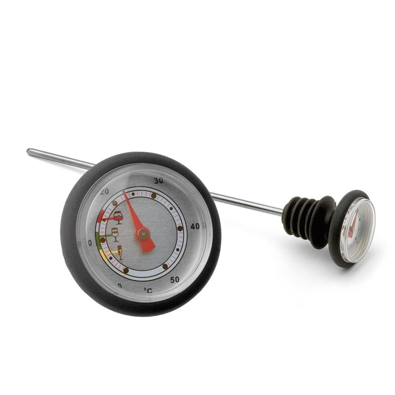 Termometr wskazuje temperaturę od 0ºC do 50ºC. Posiada również wskazówki dotyczące odpowiedniej temperatury wina musującego, wina białego oraz czerwonego. Tego typu termometr wskazuje precyzyjnie temperaturę wina ponieważ umieszczamy go w winie, nie na butelce.