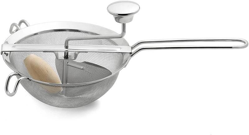 Wielkość oczek w sitku to 1,5 mm. Przecierak wyposażony jest w dwa haczyki umożliwiające stabilne zamocowanie na naczyniu. Z narzędzia można również korzystać jak z klasycznego sitka.