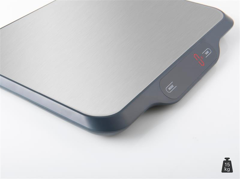 Duża powierzchnia wagi umożliwia ustawienie większego naczynia, np. miski lub garnka. Wierzch wagi wykonany jest z matowej stali nierdzewnej. Antypoślizgowe stópki zadbają o jej stabilność.