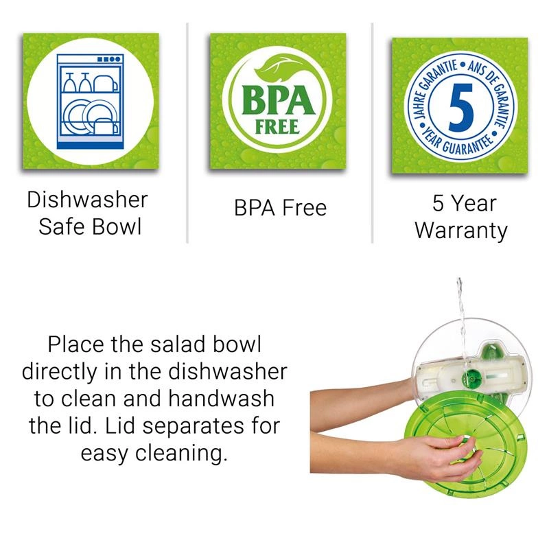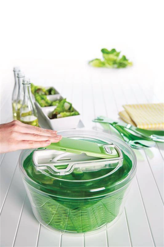 Wirówka ma transparentną obudowę dla lepszej kontroli podczas odwirowywania. Na dnie antypoślizgowa podstawa, zapobiega przesuwaniu się i zabezpiecza blat. Pokrywa jest biało-zielona, na niej znajduje się dźwignia, która wprawia w ruch kosz wewnątrz suszarki. Wystarczy parę razy nacisnąć, aby osuszyć umyte liście. Wszystko odbywa się bez większego wysiłku i w parę chwil. Gdy skończysz suszenie, przycisk stop pomoże Ci zatrzymać wirujący kosz. Dźwignię możesz złożyć, podczas przechowywania zajmuje mniej miejsca.