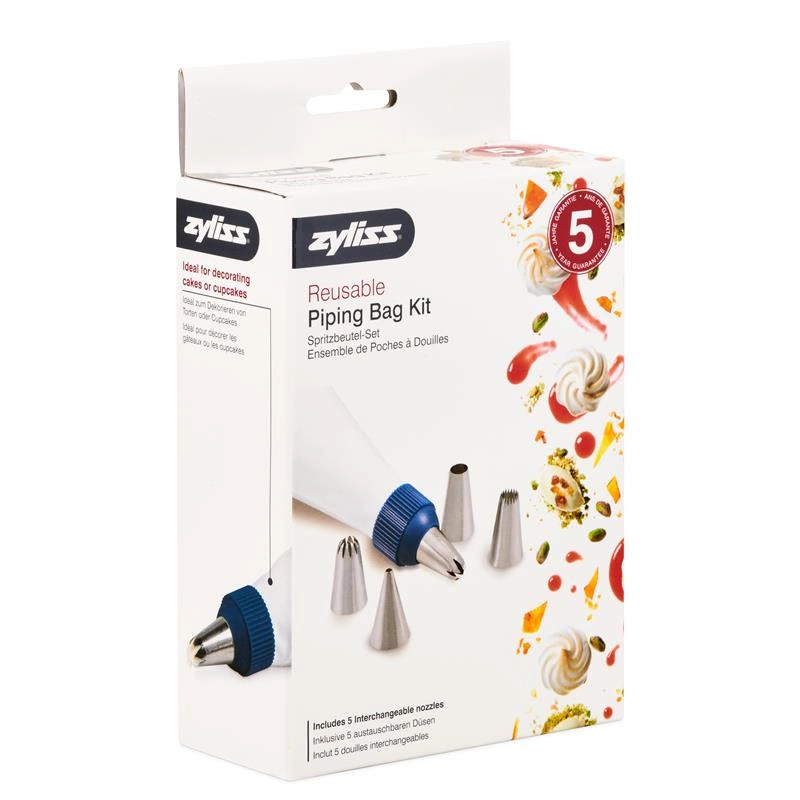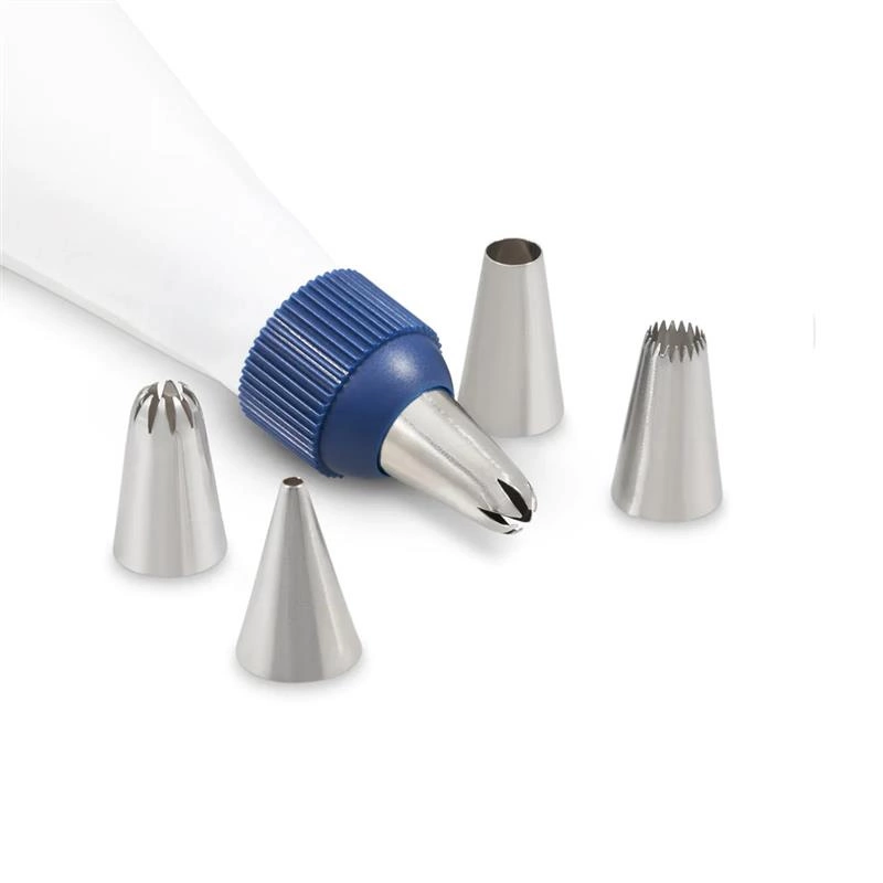 Do rękawa dołączone jest 5 stalowych tylek - końcówek, umożliwiających rozmaite zdobienia - napisy, fale, gwiazdki, liście i kwiaty.