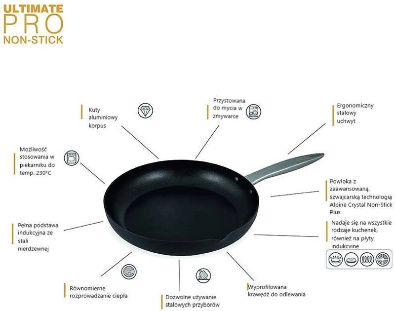 Powłoka patelni Ultimate PRO jest wykonana przy wykorzystaniu zaawansowanej szwajcarskiej technologii, która zapobiega przywieraniu. Powłoka ALPINE CRYSTALS zapewnia doskonałą odporność na przywieranie i zdrowsze gotowanie, dzięki czemu możliwe jest wyeliminowanie stosowania oleju lub masła. Ponadto powłoka jest na tyle trwała, że można używać na niej stalowych przyborów kuchennych. Gruby anodowany korpus patelni z serii Ultimate PRO jest zaprojektowany tak, aby wytrzymać codzienne użytkowanie oraz zapewnić równomierne rozprowadzanie ciepła na całej powierzchni naczynia. Odpowiednia grubość dna zapewnia, że patelnię można stosować na wszystkich rodzajach kuchenek, w tym także indukcyjnych.