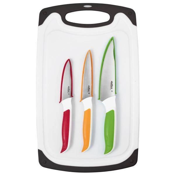 Praktyczny zestaw 3 noży z ochronnymi osłonami ostrzy oraz dużą i wygodną deską do krojenia.