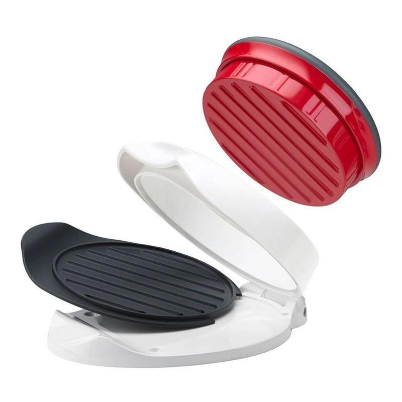 Po doprawieniu mięsa wystarczy je włożyć w praskę, która je właściwie uformuje, a czarna wysuwana tacka, wykonana z nieprzywierającego tworzywa pomoże Ci w ułożeniu gotowego burgera na patelni lub grillu.