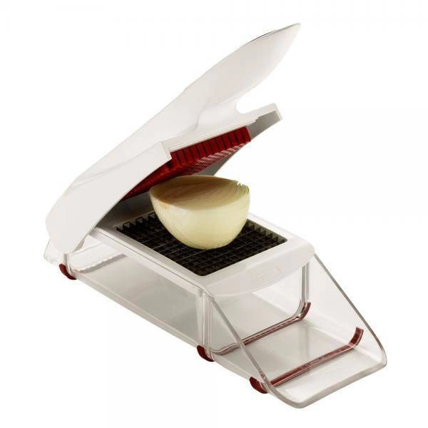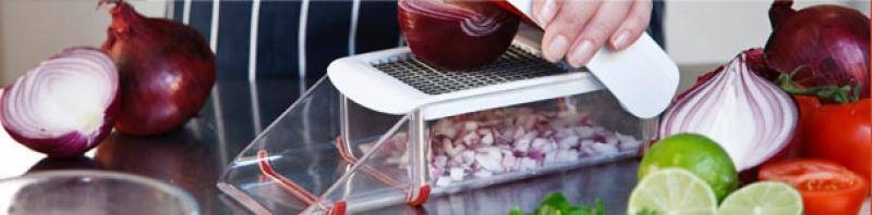 Siekacz marki Zyliss szybko i sprawnie pokroi w kostkę cebulę i inne warzywa jednym ruchem.