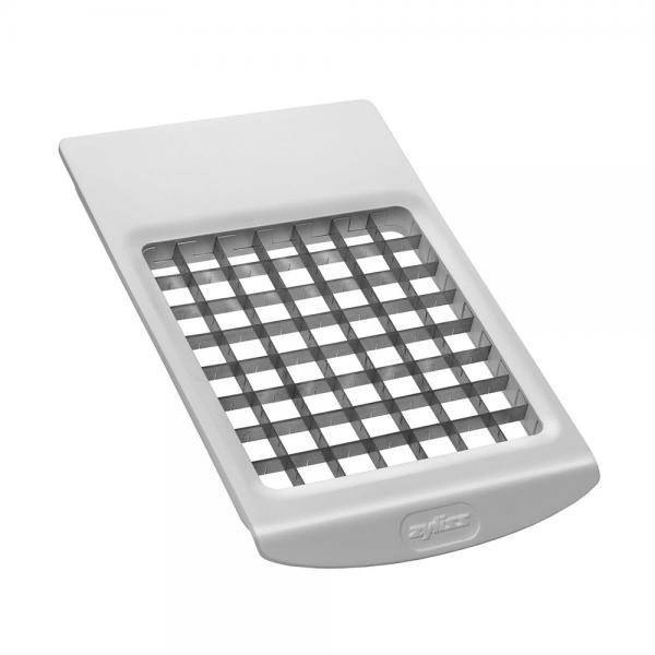 W zestawie dwie wkładki do regulacji wielkości kostki 6 mm i 12 mm. Siekana cebula, papryka, cukinia trafia bezpośrednio do pojemnika, nie powodując bałaganu. Na dnie pojemnika są antypoślizgowe wypustki zapewniając stabilność całemu narzędziu.
